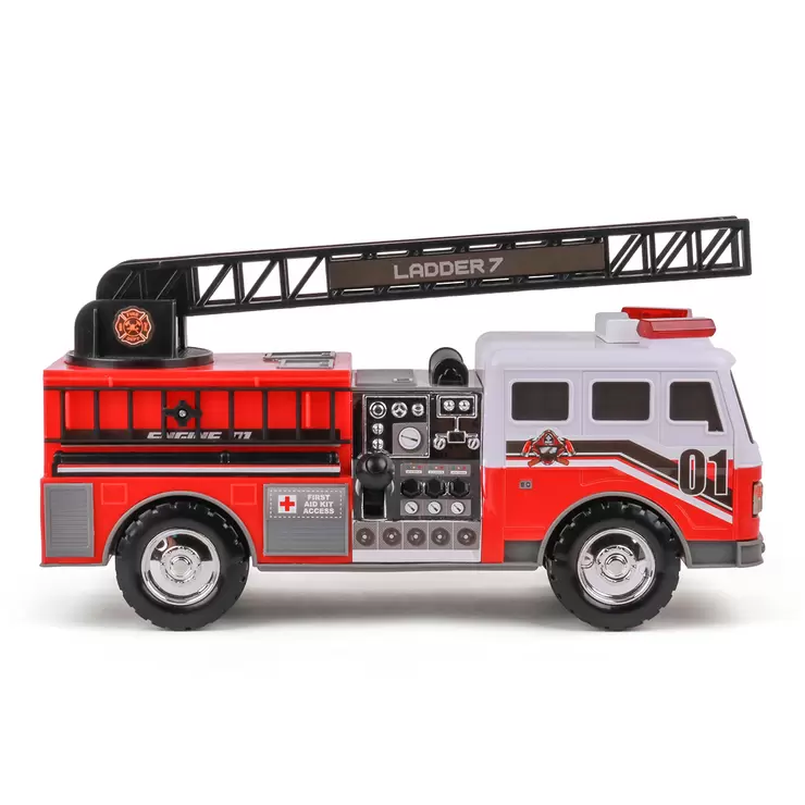El Camión de Bomberos Mighty Fleet Motorized está repleto de acción con múltiples características que incluyen una escalera motorizada que se extiende y una hiper iluminación realista. Tire de la palanca para girar la escalera de izquierda a derecha o mueva la escalera manualmente para subirla o bajarla. ¡Este camión de bomberos está totalmente equipado con sonidos realistas y luces intermitentes con solo presionar un botón!