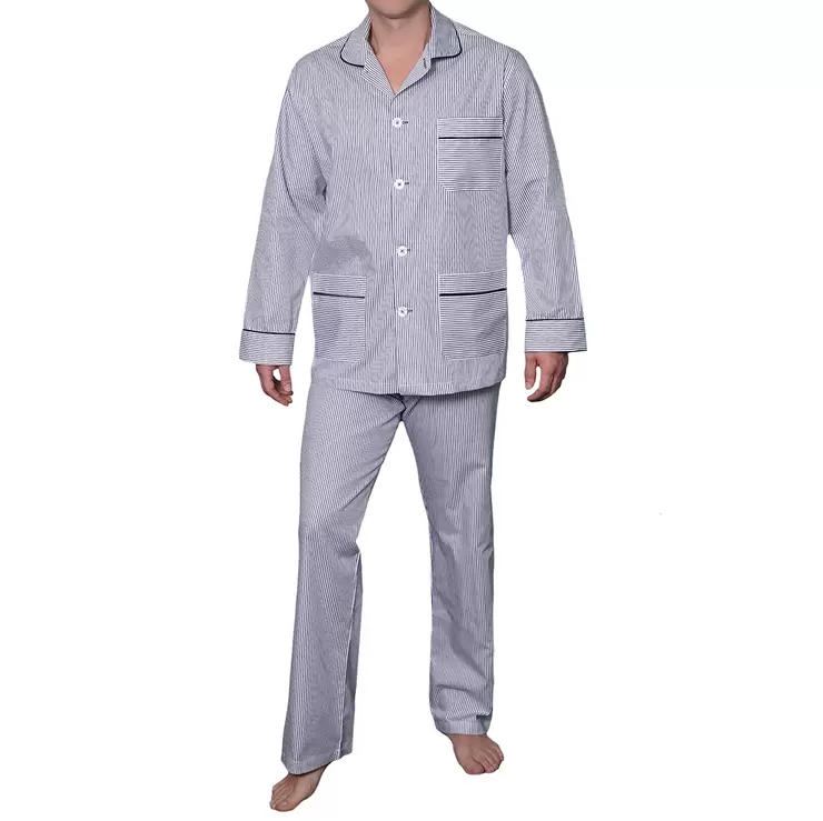 Juego de pijama manga larga con pantalón corte clásico, 100% algodón. Camisola abierta de botones con tres bolsillos, cuello solapa y vivos a contraste. Pantalón largo a juego, de corte recto, con cintura elástica y cierre con botones, 100 % Algodón Cierre de Botón Juego de pijama 100% algodón para hombre. Mangas largas, botones en la parte superior, tres bolsillo frontal Diseño perfecto para dormir, gran regalo para familiares y amigos. Instrucciones de lavado: lavar a menos de 30 grados Celsius, no usar lejía, colgar para secar, planchar a 150 grados Celsius, no lavar en seco.