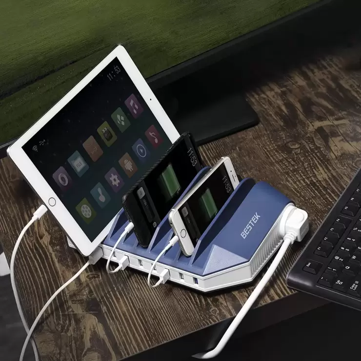 Un experto en carga de energía perfecto con 10 puertos USB, 2 salidas de CA, para ayudar a cargar múltiples dispositivos y administrar los cables de carga.