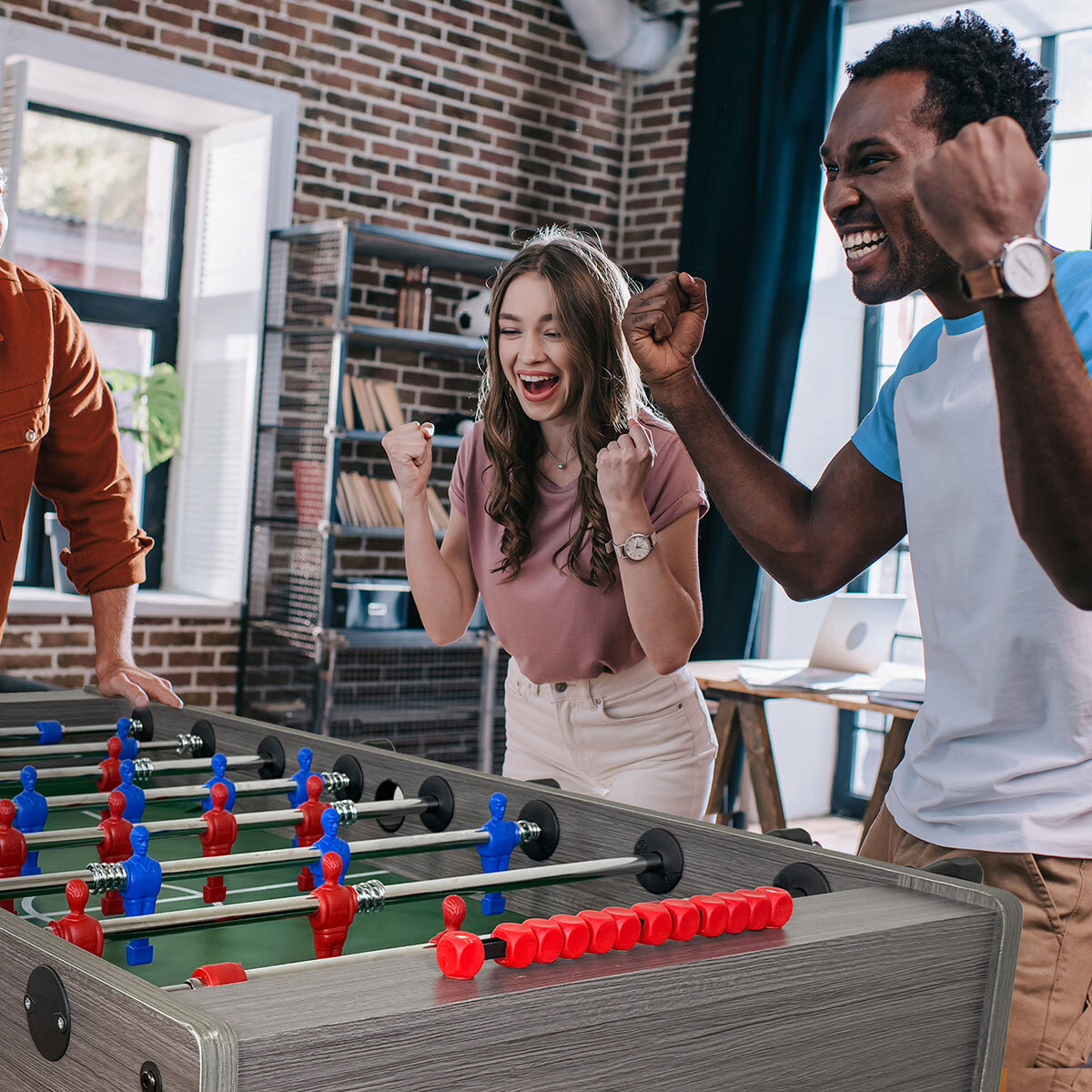 La superficie de juego está hecha de vidrio templado, permitiendo que la pelota se deslice sin dificultad alguna, otorgando un juego continuo. Además de que las robustas patas de acero están equipadas con niveladores de piso para otorgar un campo de juego perfectamente equilibrado.