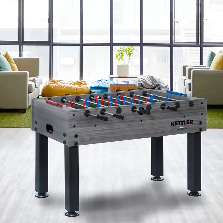 Transforma tu hogar con la mesa de futbolito Tournament de Kettler. Fabricada meticulosamente en Italia sobre un mueble laminado en roble gris, esta mesa ofrece una estética elegante y moderna que se adapta a cualquier espacio. Su superficie de juego de vidrio templado permite que la pelota se deslice sin dificultad, garantizando un juego fluido y continuo. Además, sus robustas patas de acero están equipadas con niveladores para asegurar un campo de juego perfectamente equilibrado en cualquier superficie.