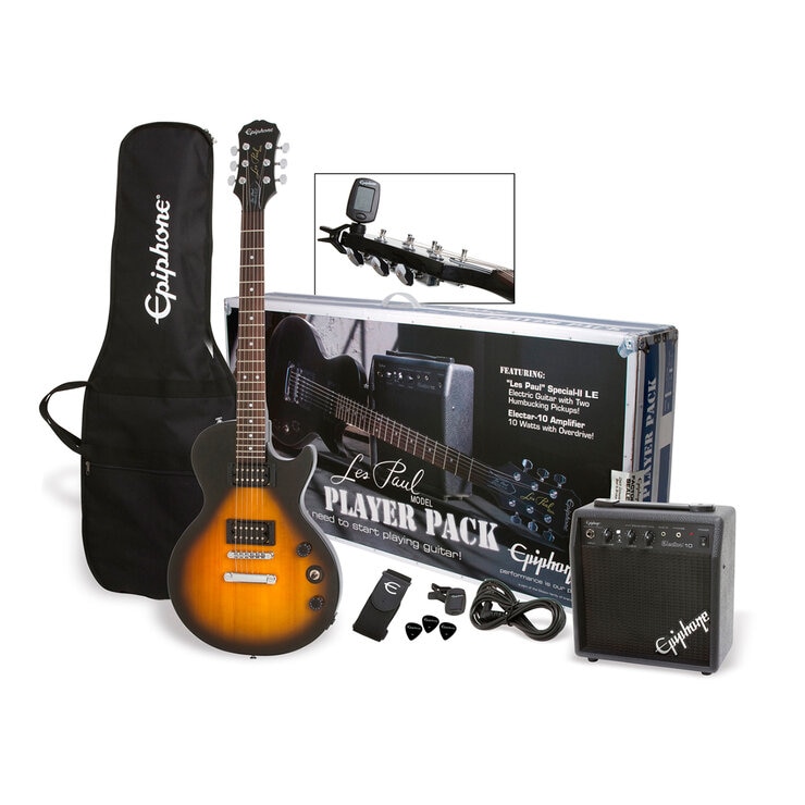 ¡El Epiphone Les Paul Player Pack te ofrece una excelente guitarra, un amplificador combinado y todo lo que necesitas para comenzar a tocar la guitarra eléctrica! Obtienes una guitarra eléctrica de cuerpo sólido Epiphone Les Paul de calidad con dos pastillas humbucking y un mástil rápido para facilitar el traste, un amplificador de 10 vatios con un interruptor clean/crunch, una funda, un afinador con clip, una correa y púas. El Les Paul Player Pack también incluye instrucciones descargables para empezar bien. Cuando aprenda a tocar un instrumento de calidad que suene bien, se sentirá inspirado para seguir tocando. Calidad, excelente sonido y asequibilidad es lo que le ofrece el Epiphone Les Paul Player Pack.