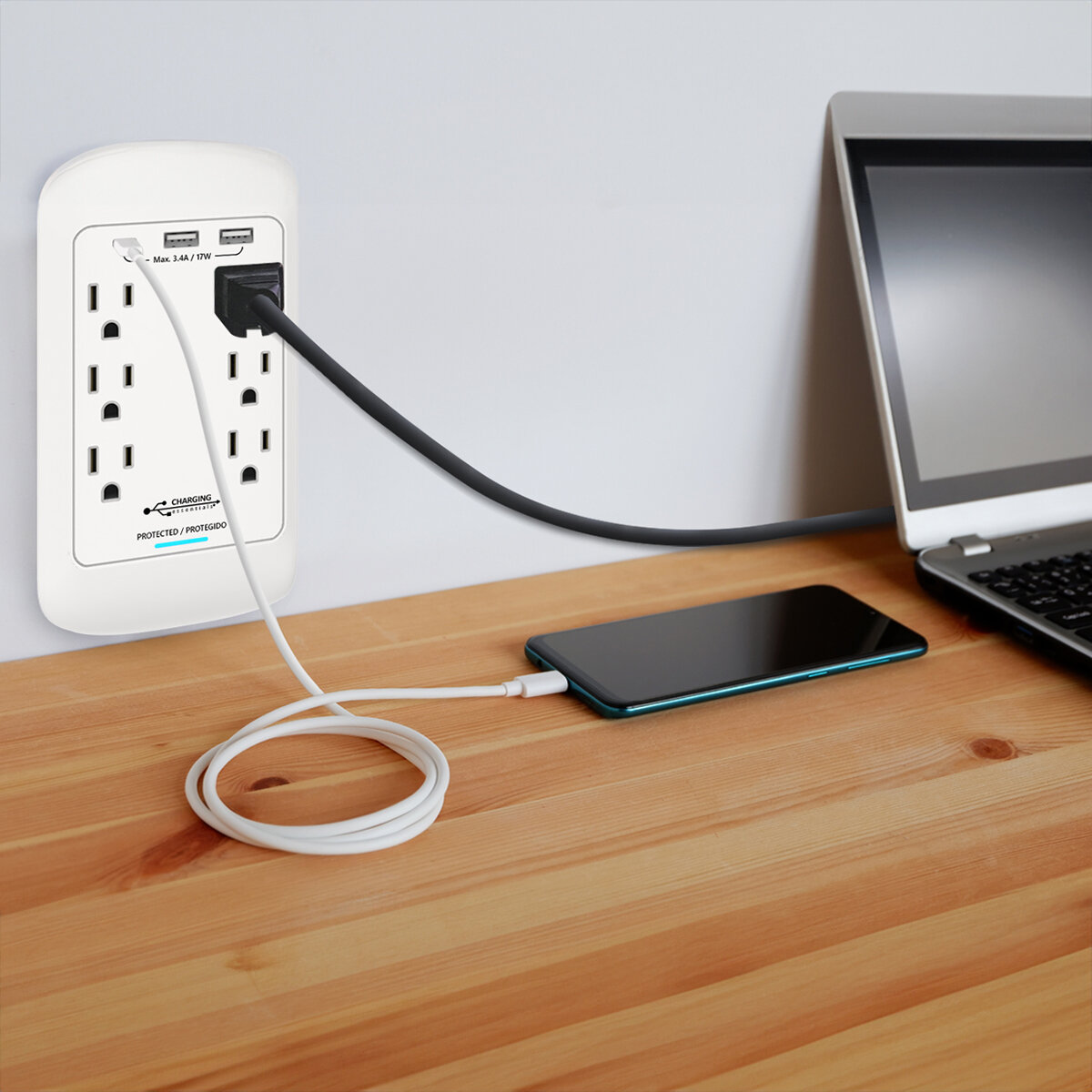 Mantén controladas tus necesidades de carga con el Juego de 2 tomacorrientes de Pared USB A + C que ahorran espacio. Los tomacorrientes de carga incluyen 6 tomas CA y dos puertos de carga USB A y 1 USB C. Ya no será necesario buscar tomacorrientes disponibles.