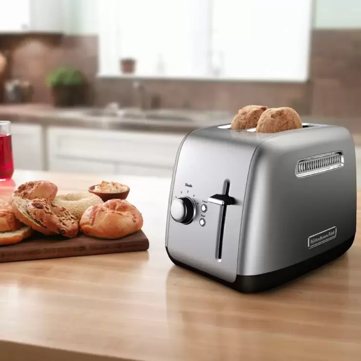 El tostador de 2 rebanadas de KitchenAid tiene botones cromados que brillan con luz de fondo azul cuando están en uso. Las ranuras extra anchas aceptarán los panecillos, panes o pasteles más gruesos y la cavidad de tostado extra profunda de acero asegura un dorado uniforme. Las rejillas ajustan automáticamente el ancho de la ranura para rebanadas gruesas o delgadas, manteniendo los alimentos en posición vertical para un tostado uniforme. Cuando la comida está lista, la palanca manual de elevación alta facilita sacarla de la tostadora. La selección de la función de tostado de panecillos reduce la potencia en un lado de los elementos de calentamiento en un 50% para producir un panecillo tostado mejor. Además, el ajuste de 5 tonos ajustables asegura que su comida se abrirá de la forma que más le guste.