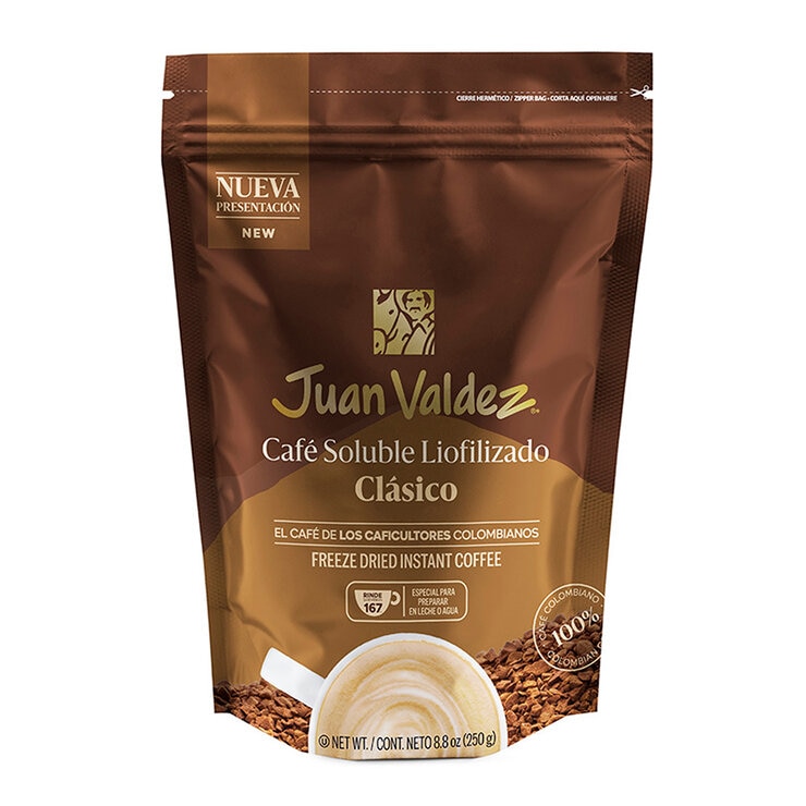 Descubre la esencia pura del café colombiano con nuestro Café Juan Valdez Liofilizado Clásico, envasado en Doypack de 250 g.