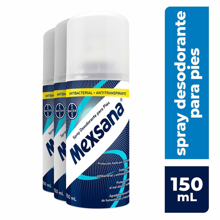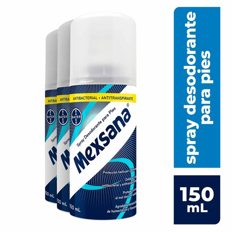 Mexsana Spray es el desodorante que protege los pies de toda la familia del mal olor y el sudor. Gracias a su fórmula con doble acción antibacterial y antitranspirante protege de hongos y bacterias causantes del pie de atleta y onicomicosis. Brinda una agradable sensación de frescura durante todo el día e impide la acumulación de humedad en los pies, principalmente entre los dedos. Seca rápidamente sin dejar huella.
