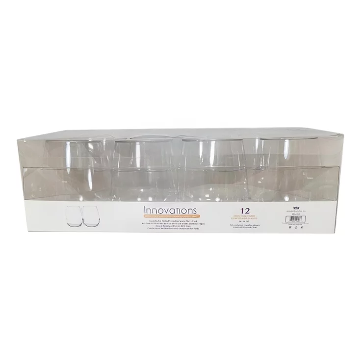 Cada paquete contiene 12 copas de vino transparentes sin tallo. Tiene capacidad para aproximadamente un 20% más de onzas líquidas que las copas de marcas competitivas. Copas de vino y caja hechas de material PET reciclable.