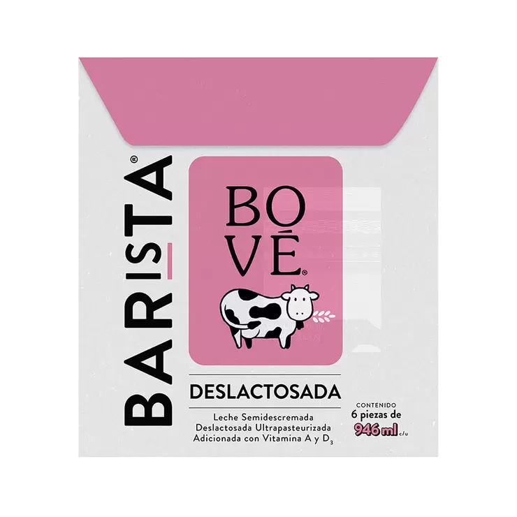Six Pack Leche Deslactosada Barista 946 ml c/u Bové es un producto de alta calidad y gran sabor, leche semidescremada deslactosada de vaca, adicionada con vitamina A y vitamina D3. Ideal para hacer preparación de café con un exquisito sabor cremoso con el cuerpo y textura deseados igual que en una cafeteria. Ideal para personas que sufren de intolerancia a la lactosa, es una leche especializada por excelente funcionalidad para espumar.