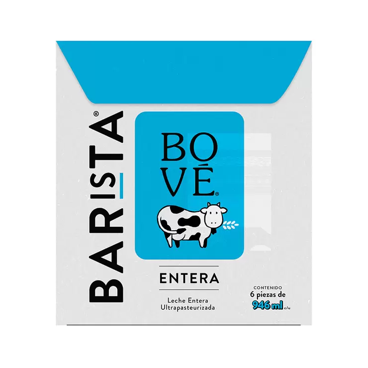Six Pack Leche Entera Barista 946 ml c/u Bové es un producto de alta calidad y gran sabor con leche entera de vaca. Ideal para hacer preparación de café con un exquisito sabor cremoso con el cuerpo y textura deseados igual que en una cafeteria. Leche especializada por excelente funcionalidad para espumar.