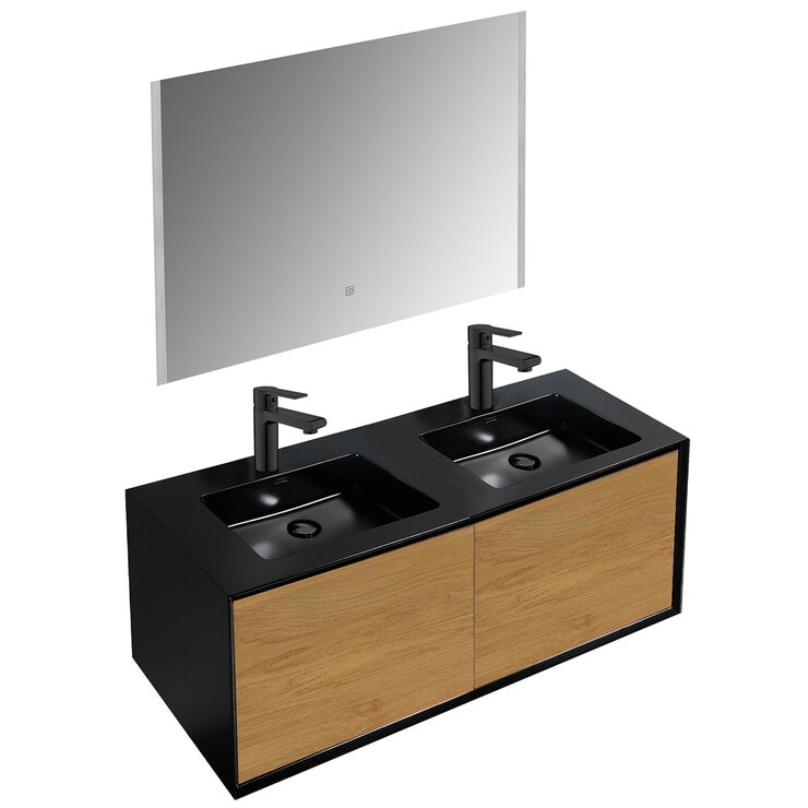 - Encimera negra con 2 lavabos rectangulares de cerámica.