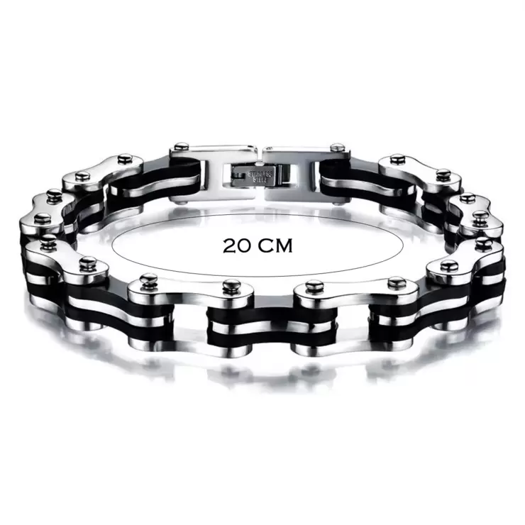 Pulsera de acero inóxidable, plateado con negro, cadena e eslabones estilo biker, tiene broche de seguridad. Resistente a corrosión y manchas.
