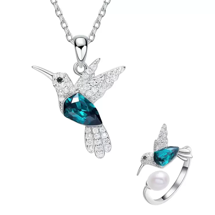 Elegante juego de anillo con collar de colibrí decorado con cristal austriaco verde esmeralda. El collar es plata 925 con cristal austriaco, el anillo para poder ser ajustable es aleación de metal bañado en rodio con cristal austriaco y perla.