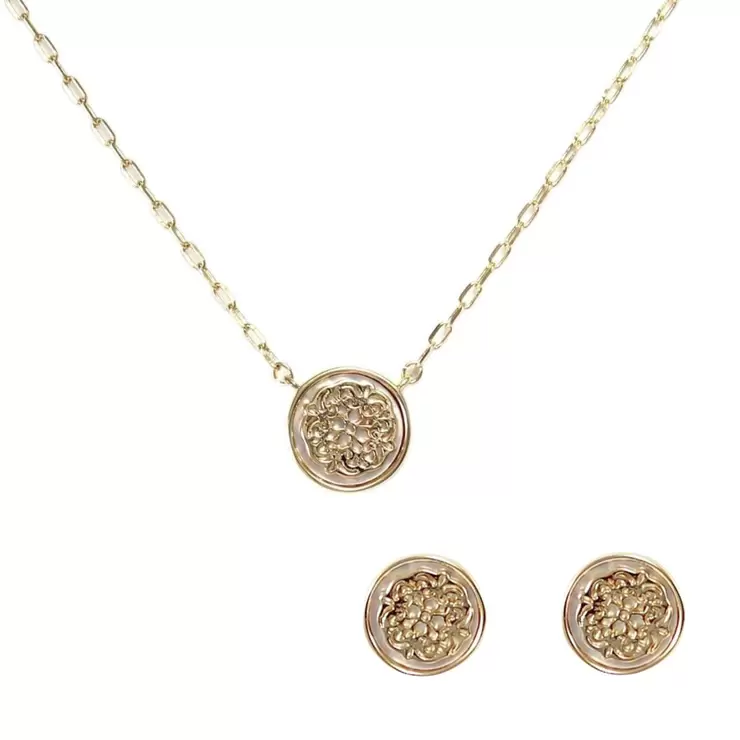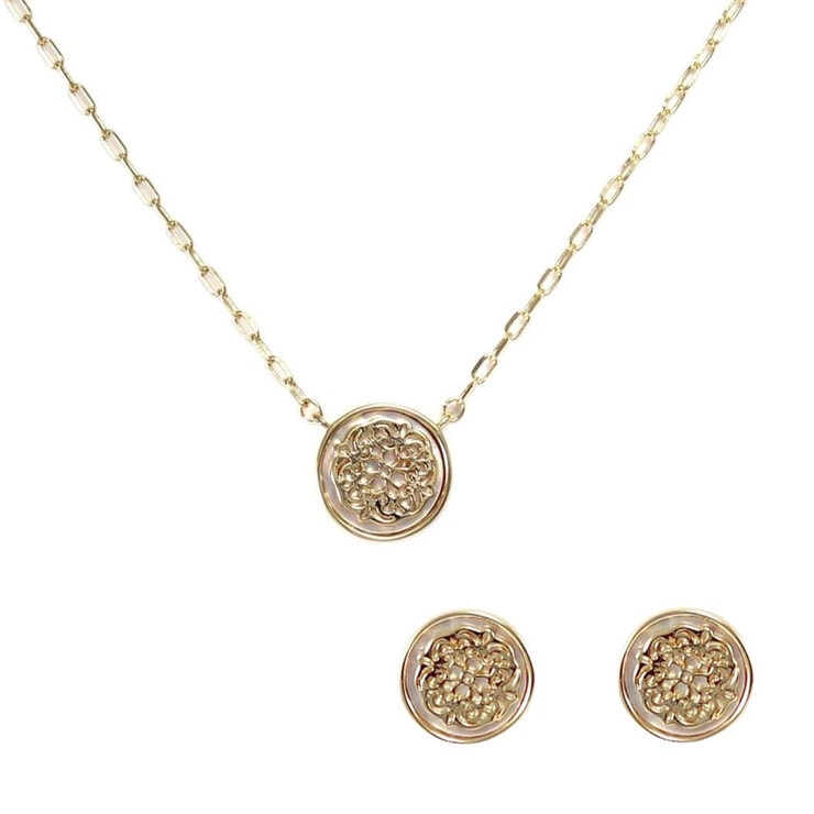 Hermoso collar ajustable y reversible de mandala dorado con madre perla y aretes a juego. Fabricado en aleación de metal bañado en oro con detalles de madre perla por un lado y todo dorado del otro y aretes dorados con madre perla a juego.