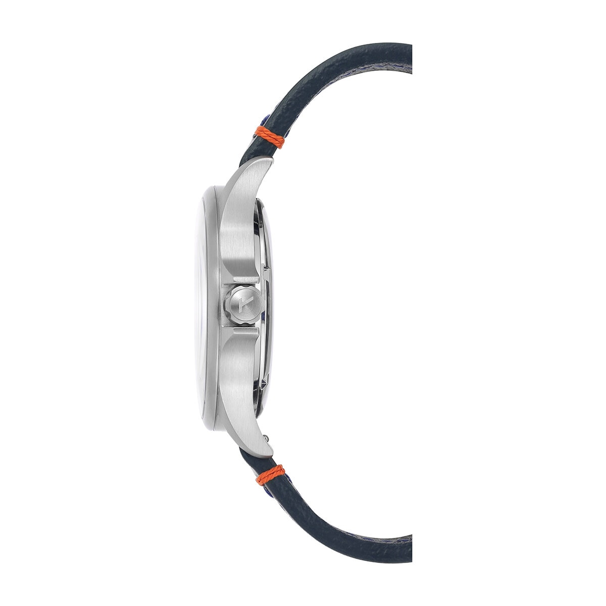 - Correa de piel azul con pespuntes naranjas en contraste.