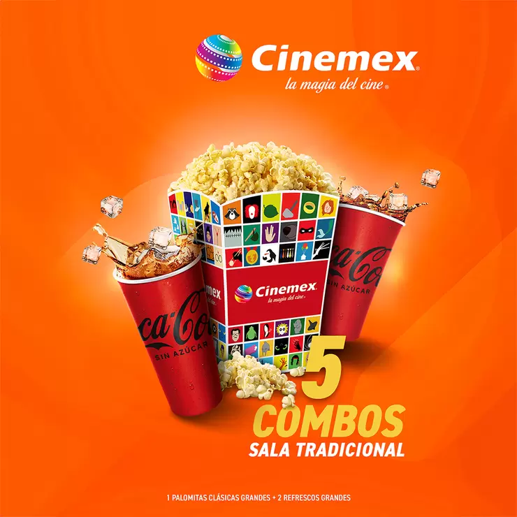 La tarjeta es canjeable por 5 (cinco) combos prepagados de lunes a domingo en complejos Tradicionales Cinemex® de la República Mexicana. El combo incluye: unas palomitas grandes clásicas (100 g aprox), dos refrescos grandes (946 ml) c/u. Cambia el sabor de tus palomitas por $20 más directo en dulcería. El cambio de sabor de bebida a Fuze Tea tiene un precio de $5 pesos extra c/u pago directo en dulcería. No incluye Refill. Para realizar el canje de los combos es indispensable realizar la activación de la tarjeta en dulcería, la cual tendrá vigencia de 6 meses a partir de la activación. Esta tarjeta prepagada es válida sólo por el balance de la misma y podrá ser redimida únicamente Tradicional Cinemex®. No aplica con otras promociones, descuentos, premieres, preventas, eventos especiales, compras en línea, ni para conceptos, Cinemex Platino®, Cinemex Market ®,