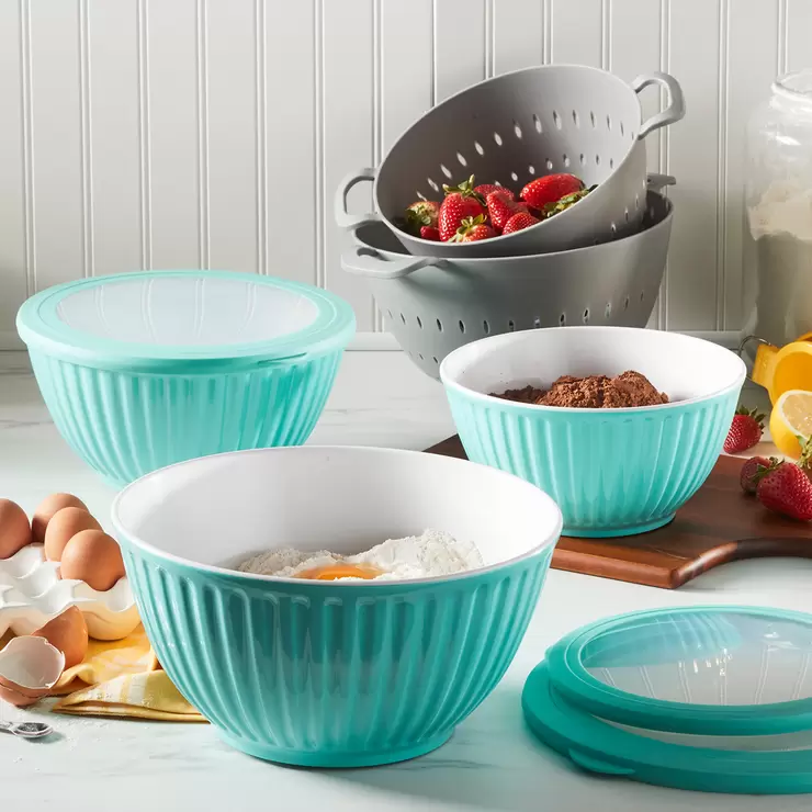 Este juego bicolor de tazones para mezclar y coladores estan hechos 100% de melamina de alta resistencia. Los tazones con tapas se puede usar para preparar, servir y almacenar alimentos; y el juego de los coladores son ideales para diversas tareas de cocina, como lavar y escurrir. Además, es fácil de guardar. Son tazones apilables para guardar fácilmente.