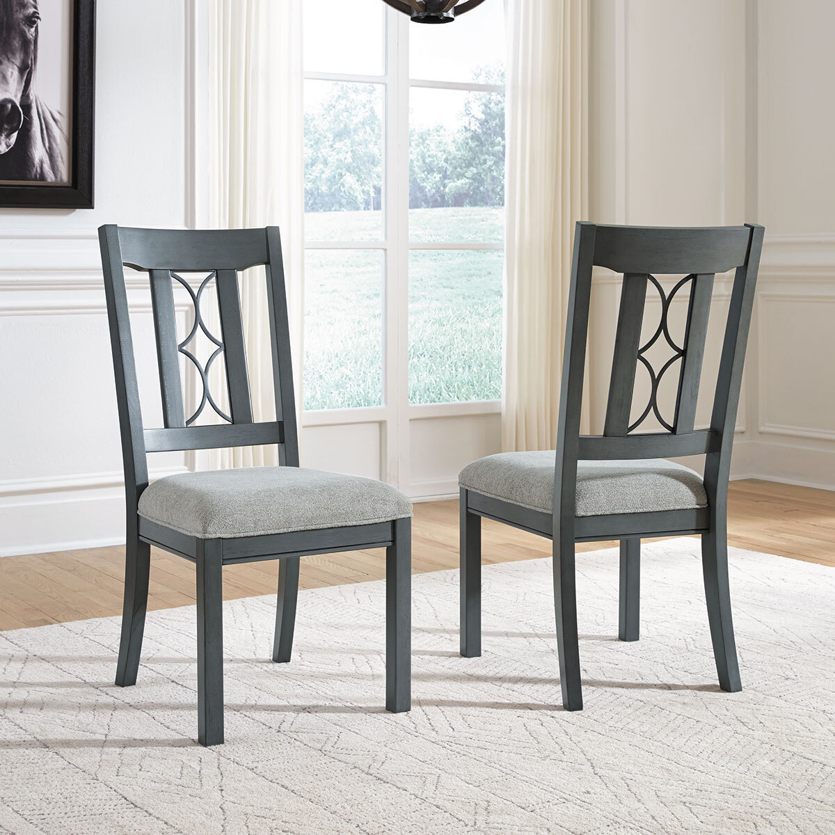 Las sillas a juego cuentan con una incrustación geométrica de metal que complementa el diseño rústico, mientras que los asientos acolchados están tapizados con una funda de tela premium para mayor comodidad mientras