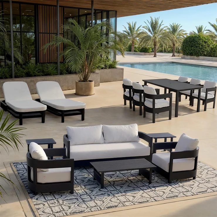 Esta magnífica colección de muebles para exteriores de 15 piezas captura la esencia del lujo moderno. Sus esculpidos armazones negros y sus afelpados cojines invitan a largas conversaciones, cenas al atardecer y momentos de tranquilidad bajo el cielo abierto. Diseñado para realzar cualquier reunión, el conjunto combina elegancia, comodidad y estilo arquitectónico, transformando cualquier patio o terraza junto a la piscina en un refugio sofisticado creado para disfrutar de la belleza del día a día.