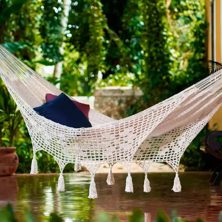 Elegante y cómoda hamaca modelo terraza tamaño queen, fabricada en algodón color arena. Longitud 4 mts, ancho 2.40 mts, peso total 3.9 kg. Producto hecho 100% a mano por mujeres artesanas de la Peninsula de Yucatán con la ayuda de un bastidor horizontal y una aguja urdidora. Hermosa hamaca a sus costados tiene un tejido de ganchillo con diseño floral, que le brinda un acabado elegante. Recomendable para interior o exterior, se sugiere no ser sometida al agua o al sol directamente. Incluye gancho y soga para colgar.