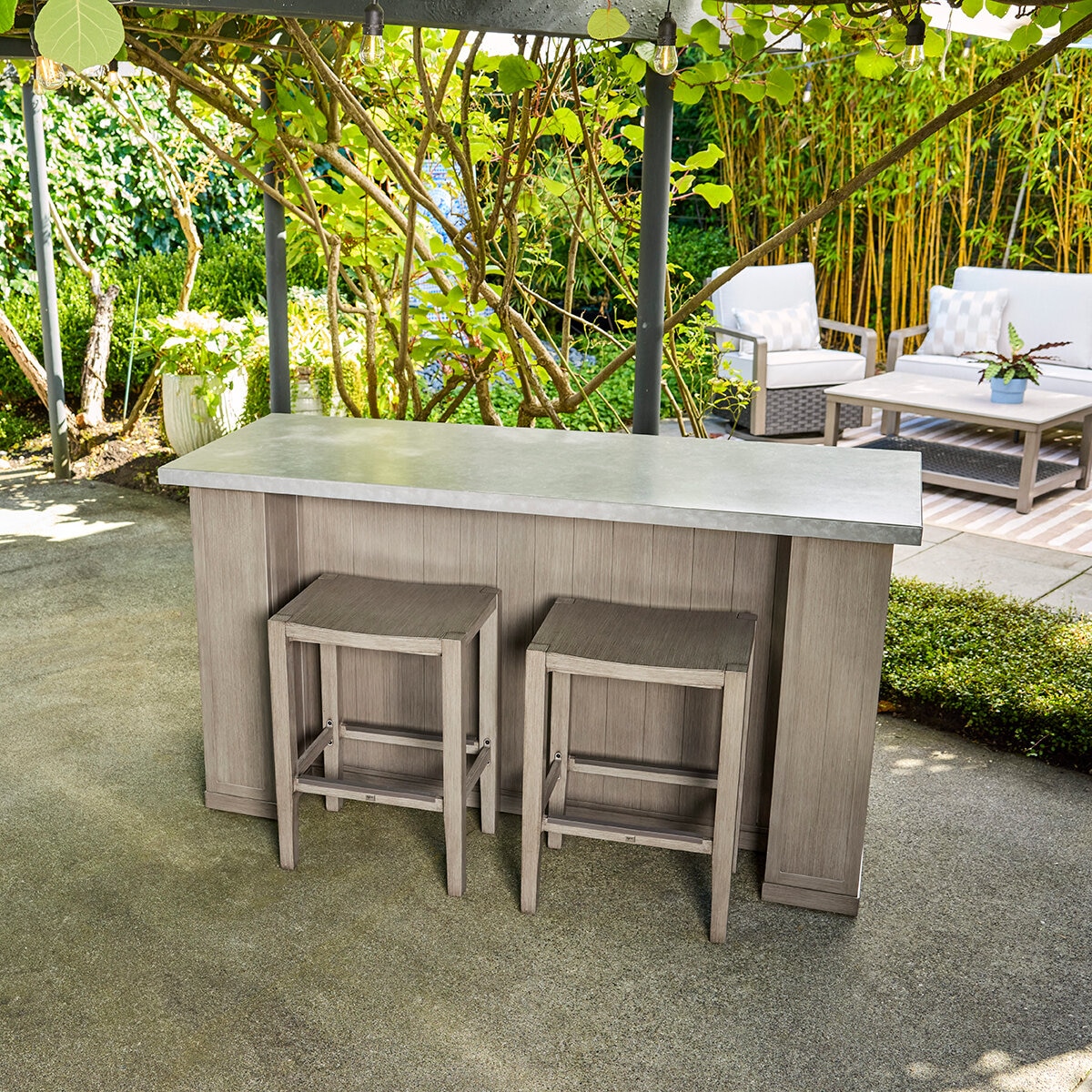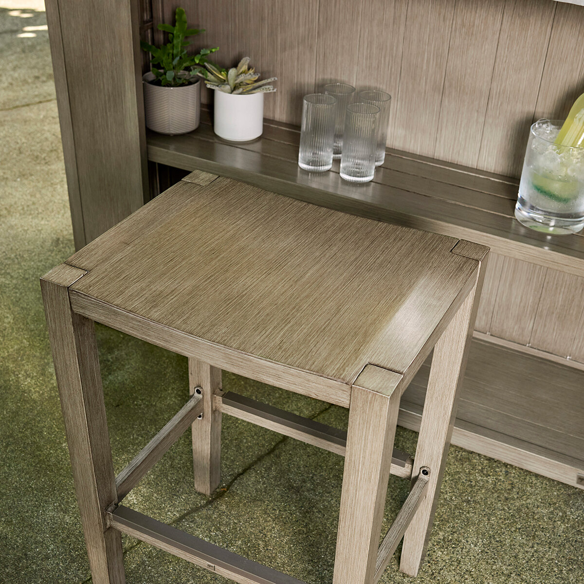 Mejore su espacio de entretenimiento al aire libre con este elegante conjunto de bar Mykonos de 3 piezas, diseñado para ofrecer funcionalidad y estilo. Con una elegante encimera metálica de imitación de hormigón, esta barra le ofrece una superficie moderna y duradera para servir bebidas y aperitivos. El frente de aluminio cuenta con una elegante fachada de tablones que añade textura e interés visual a la pieza. El Conjunto de bar Mykonos 3 piezas ofrece un diseño increíble, confort y valor para su espacio al aire libre.