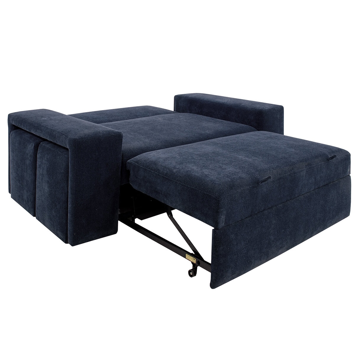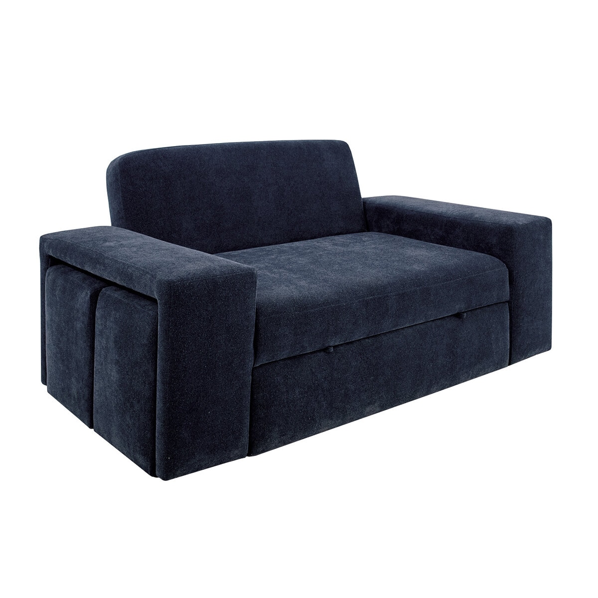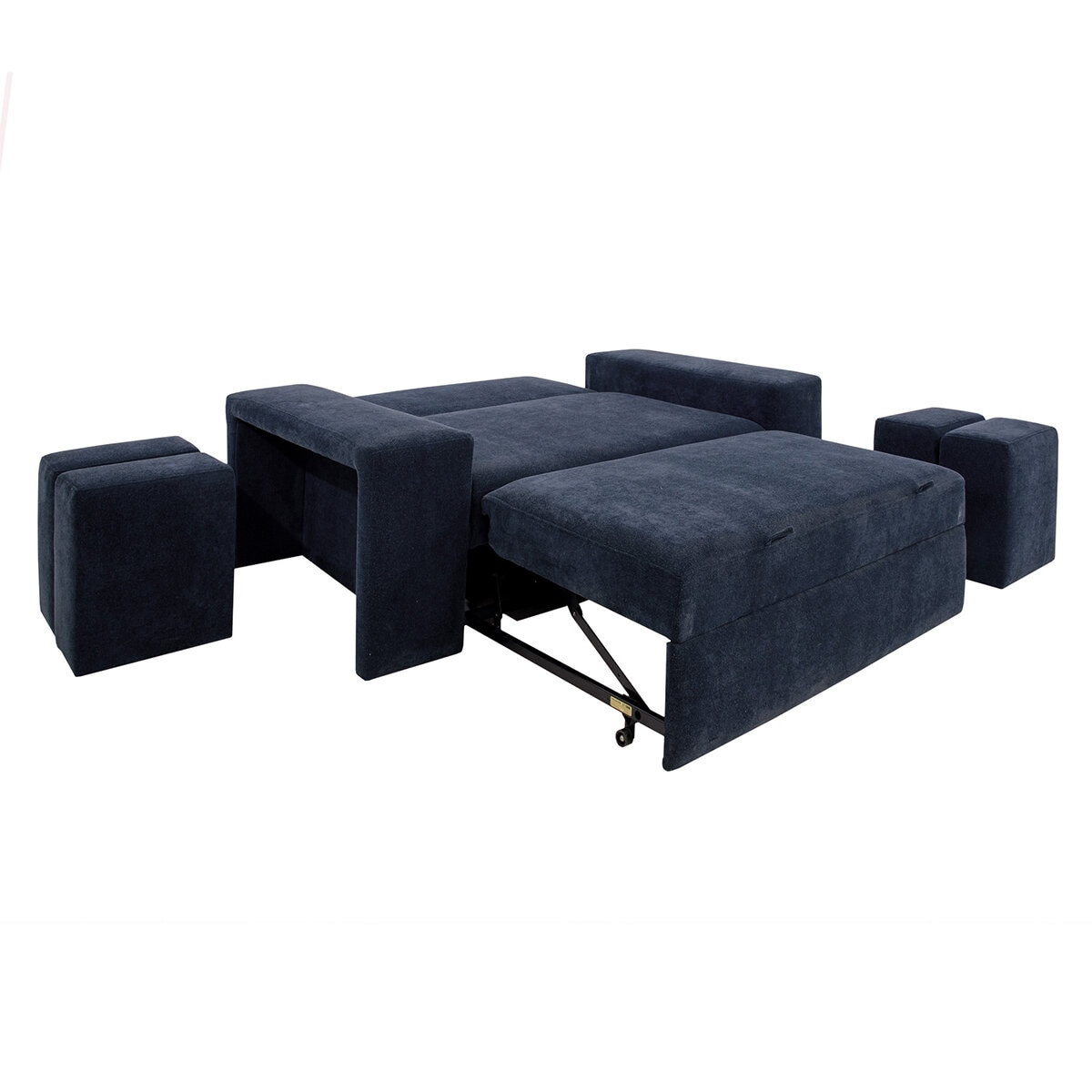 El sofá cama Carra por su gran versatilidad y comodidad le permite ahorrar espacio en su habitación, el sofá se convierte en una cama matrimonial con 3 posiciones reclinables y 4 taburetes de servicio, su estructura de madera y tela suave al tacto hacen la combinación perfecta para el descanso y confort en su hogar.