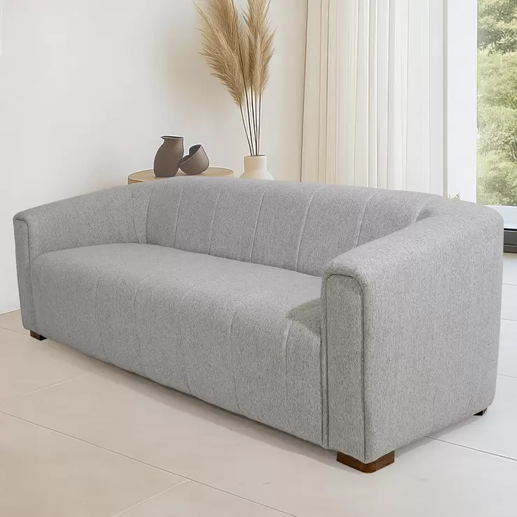 Sofá Trieste de estilo retro, es un mueble que celebra la atemporalidad del diseño clásico con un toque de modernidad. Su silueta elegante adornada con un lujoso tapizado de tela tono gris, evoca el glamour de una era pasada, asegurando que su apariencia nunca pase de moda. Cada detalle, desde las costuras delineando el asiento y respaldo, hasta las patas de madera cuidadosamente torneadas evocan a los días de esplendoroso diseño.