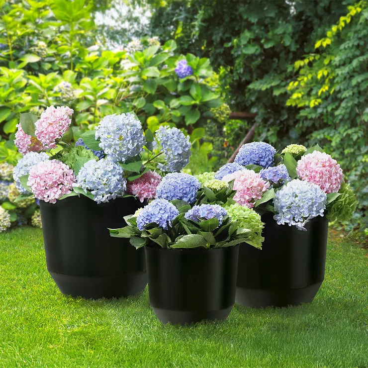 Esta colección incluye macetas de tres tamaños: Grande (45 cm de diámetro y 38.9 cm de altura), mediana (37.4 cm de diámetro y 32.3 cm de altura) y chica (30.4 cm de diámetro y 26.3 cm de altura), perfectas para una gran variedad de plantas de interior o exterior. Las macetas están hechas de plástico reciclado; se ven y se sienten como auténtica cerámica, pero son muy ligeras. Con ellas conseguirá realzar la belleza de su hogar.