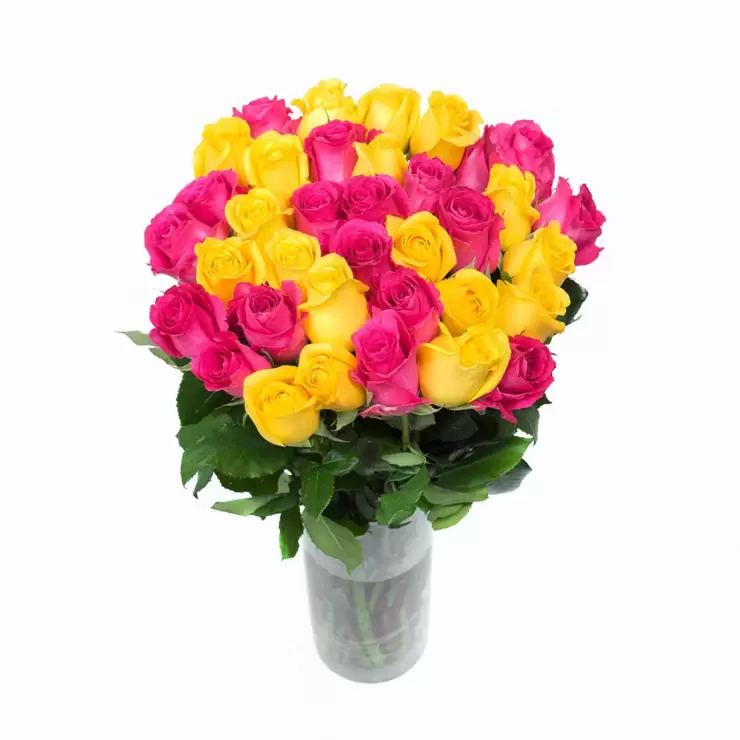 Chiltepec, Bouquet de 36 Rosas Color Fucsia y Amarillo en Florero de Vidrio