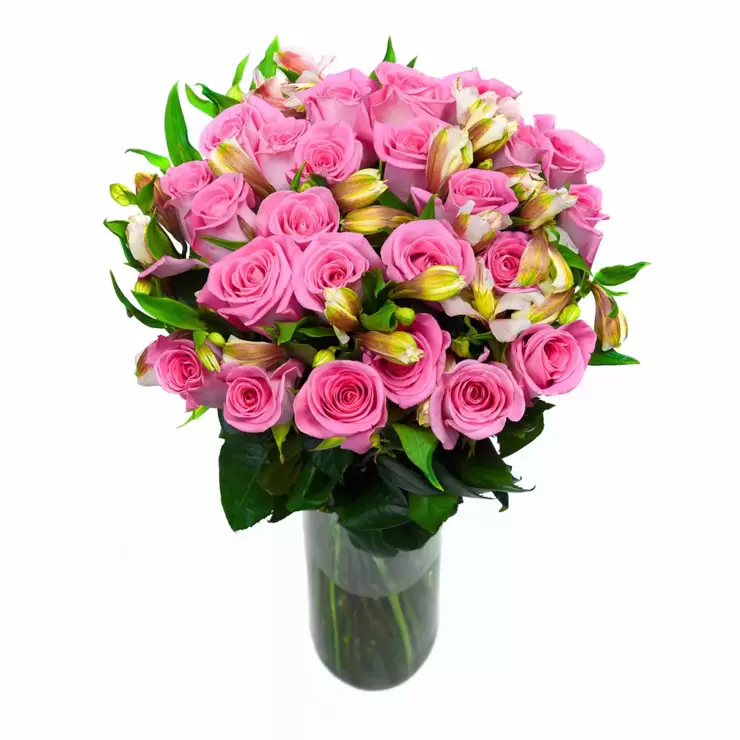 Chiltepec, Bouquet de Rosas y Astromelias en Tonos Rosas en Florero de Vidrio