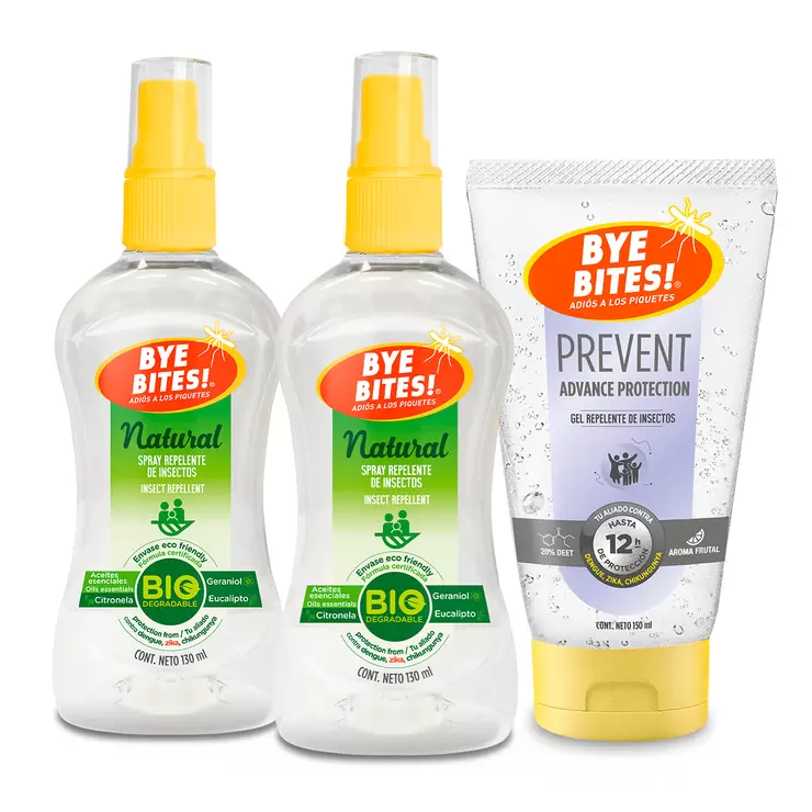 Bye Bites Natural Repelente de Insectos 2 pzas de 130 ml + Prevent en Gel Repelente de Insectos de 150 mlBye Bites Natural Repelente de Insectos 2 pzas de 130 ml + Prevent en Gel Repelente de Insectos de 150 ml