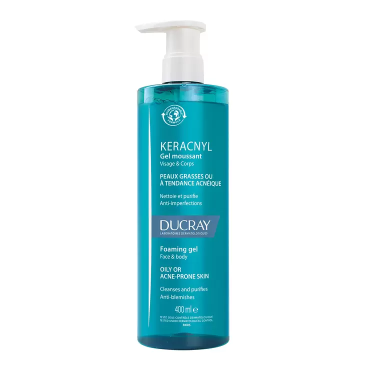 El gel espumoso KERACNYL es un gel limpiador adecuado para las pieles jóvenes o adultas con tendencia al acné
