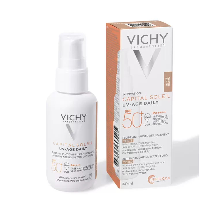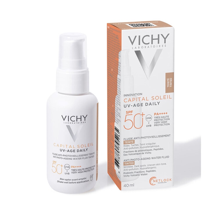 Capital Soleil UV-AGE FPS 50+ con color corrige y previene las arrugas y manchas causadas por los rayos UV + estrés oxidativo inducido por la contaminación, mientras que su base de color unifica el tono de la piel gracias a su cobertura ligera. Formato con textura ultrafluida y de rápida absorción. Textura muy ligera de rápida de absorción. Resistente al agua y al sudor. No irrita los ojos, probado oftalmológicamente. Fórmula hipoalergénica y no comedogénica.