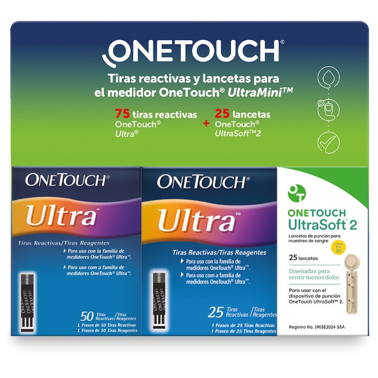 | Cantidad | 75 tiras reactivas Ultra + 25 lancetas Ultra Soft 1 |