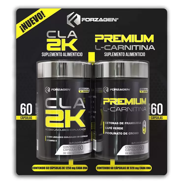 Premium L-Carnitina + CLA2K en cápsulas de Forzagen. Una combinación de l-carnitina y ácido linoleico conjugado (CLA), que en conjunto hacen una gran sinergia . L-Carnitina en cápsulas con Cetonas de Frambuesa, Café Verde y Picolinato de Cromo. Ácido Linoleico Conjugado (CLA) en cápsulas con Vitamina E.Productos hechos en Estados Unidos.