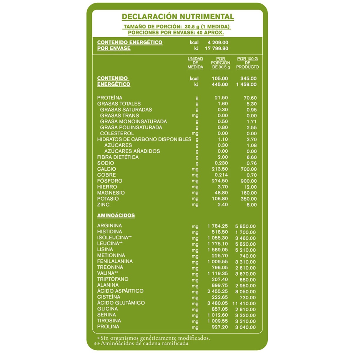 Proteína 100% de origen vegetal, fuente natural de BCAAS*, sin azúcar añadida, fuente natural de calcio y hierro, con 21.5 gramos de proteína por porción, sin ingredientes artificiales, sin rellenos ni gomas, NO GMO*, Sin Gluten