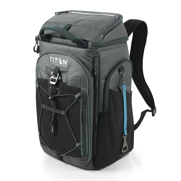La mochila hielera Titan Deep Freeze para 26 latas mantiene el hielo hasta 2 días y tiene 5 compartimentos aislados, 7 bolsillos adicionales y 2 bolsas Ice Wall extraíbles.