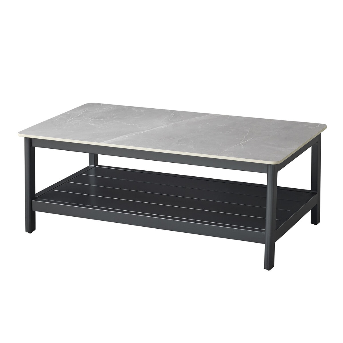 La construcción de aluminio es resistente a la oxidación. Cuenta con un acabado duradero con pintura en polvo. La base de la mesa de aluminio incorpora un estante para almacenar revistas y objetos de entretenimiento.