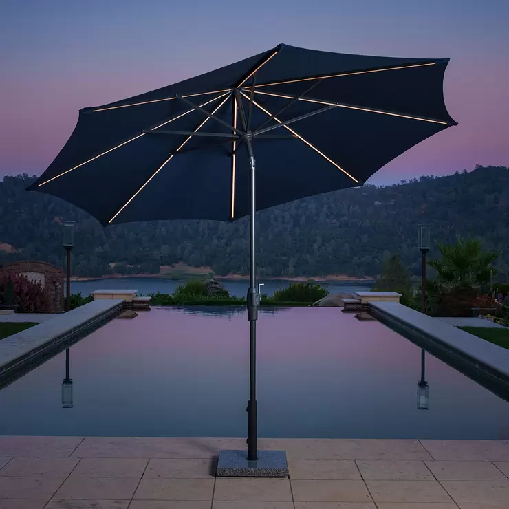 Barra de luces integradas: Las luces de barra regulables de haz completo integradas a lo largo de las varillas de la sombrilla proporcionan iluminación ambiental y añaden un brillo acogedor a su espacio al aire libre.